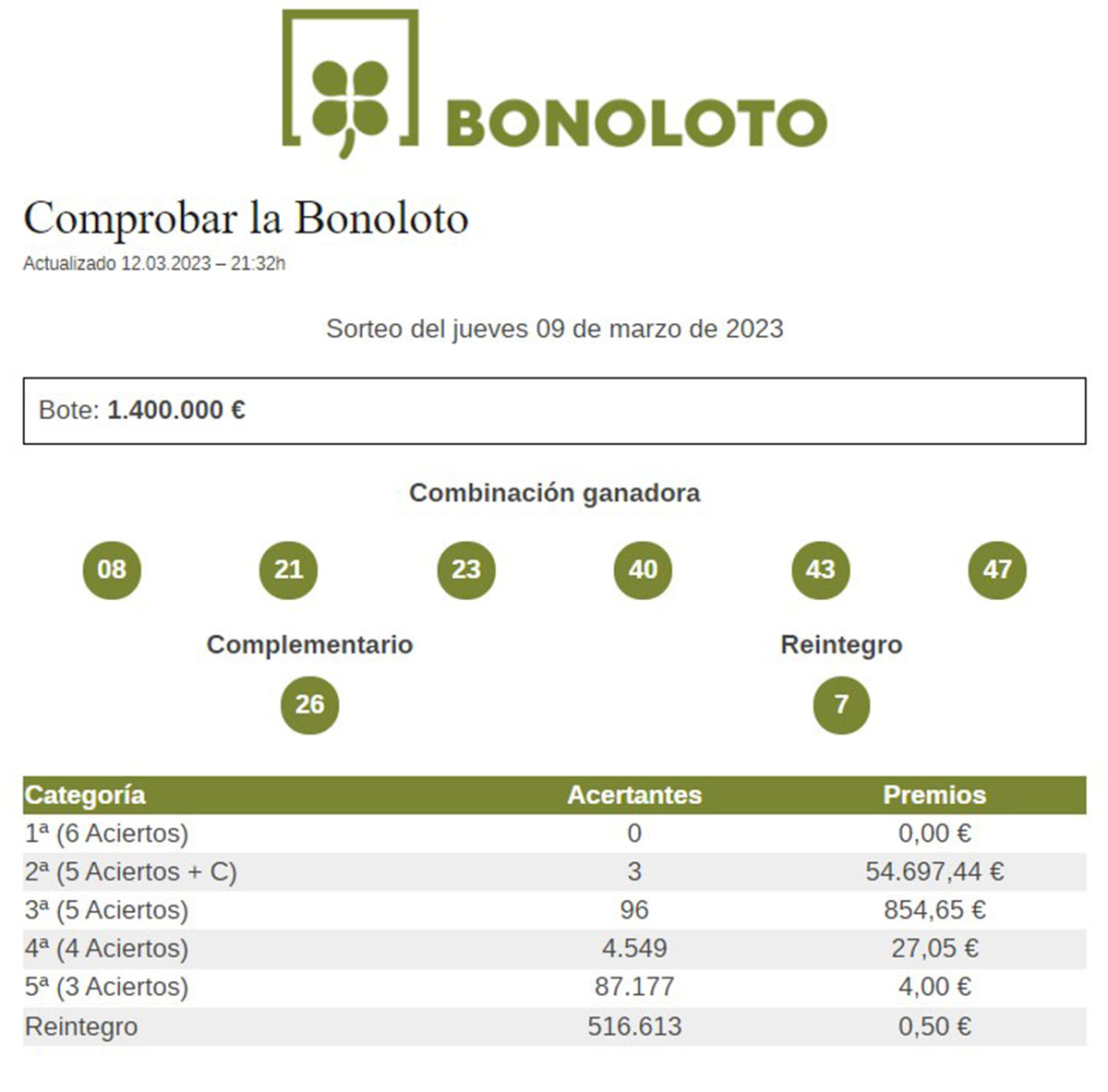 Los números premiados en el sorteo de la Bonoloto del jueves día 9 de marzo son los siguientes: