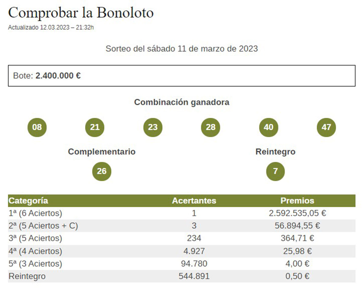 Números que prácticamente coinciden con la combinación que resultó ganadora en el sorteo celebrado de la Bonoloto del sábado día 11 de marzo, dos días después. En concreto, la combinación de números ganadores son:
