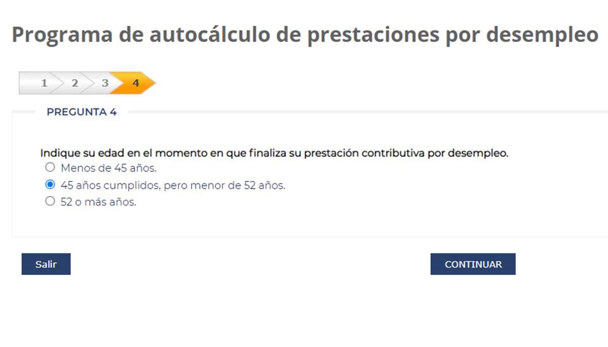 Después hay que indicar los años que tiene el solicitante en el momento de haber agotado la prestación contributiva por desempleo. En concreto, seleccionamos en este caso que tiene más de 45, pero menos de 52 años.