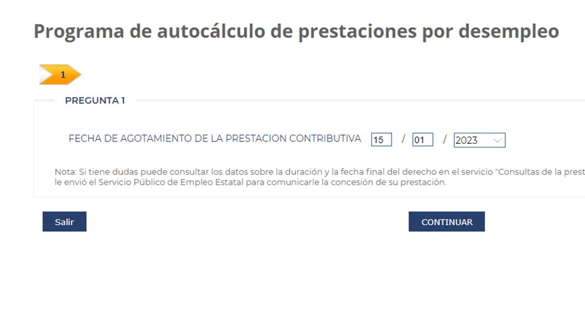 A continuación hay que indicar cuál fue la fecha en la que se agotó la prestación contributiva. Desde la herramienta señalan que, en el caso de no recordarla, puedes consultar los datos a través de la sede electrónica del SEPE. En este caso, para realizar un ejemplo indicamos que la fecha de agotamiento de la prestación ha sido el 15 de enero de 2023.