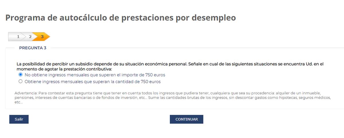 En la siguiente pestaña el programa de autocálculo indica que la posibilidad de recibir un subsidio depende exclusivamente de la situación económica personal. Por ello, hay que indicar el nivel de ingresos y rentas que entran en la vivienda de forma mensual. La barrera de diferenciación se encuentra en los 750 euros. Seleccionamos la pestaña específica de que no se obtienen ingresos de más de 750 euros.