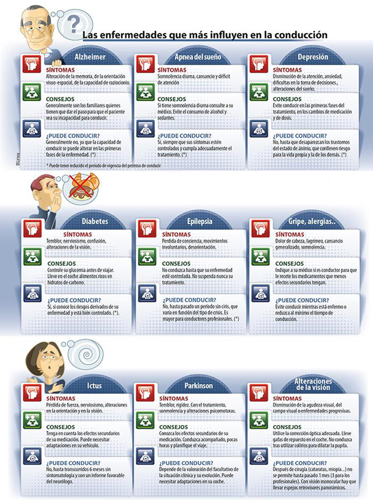 Aunque no existe prohibición expresa, la Dirección General de Tráfico señala que existen determinadas enfermedades que influyen en la conducción y pueden poner en riesgo la seguridad vial. En concreto, estas son las siguientes: