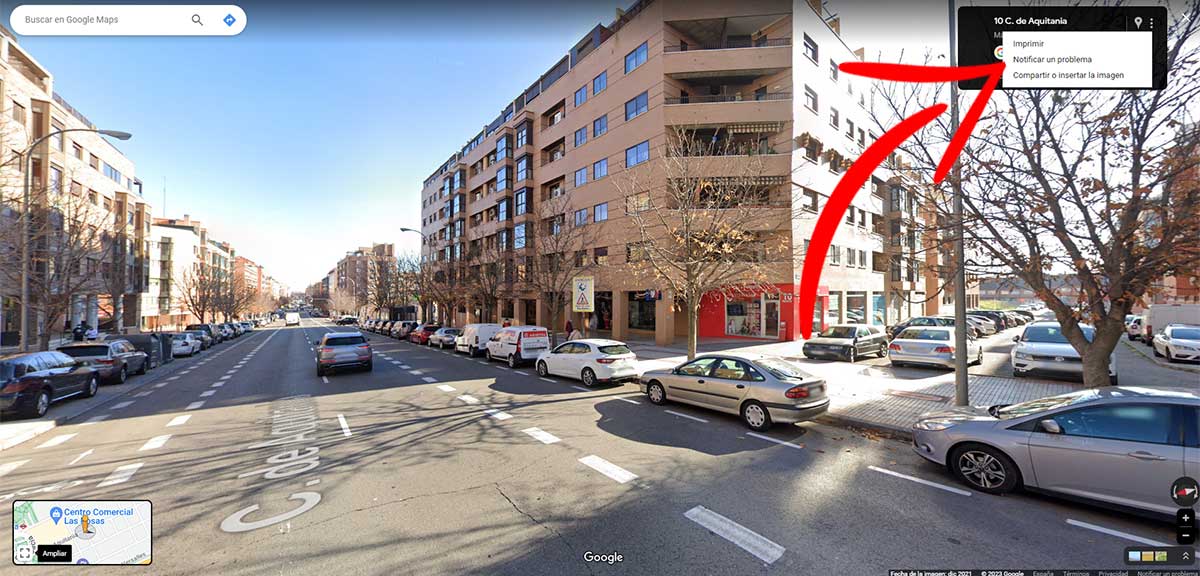 Una vez ya estés en la propia calle, debes pulsar en la esquina superior derecha sobre los 3 puntos. A continuación, haz clic en ‘Notificar un problema‘.