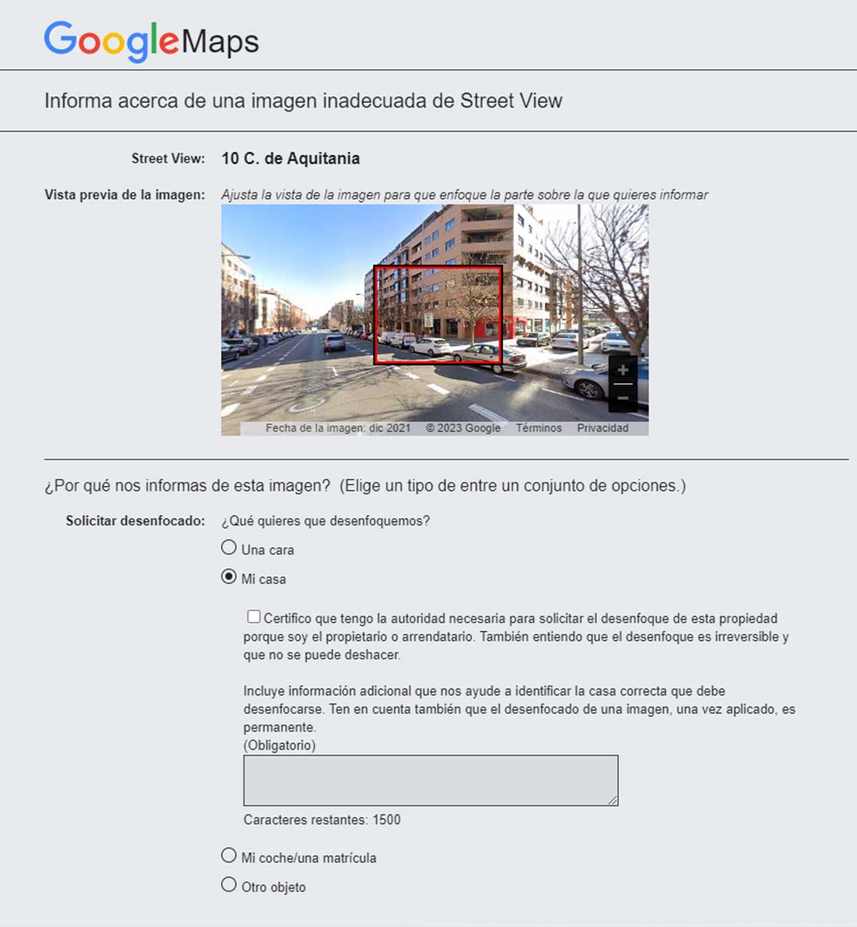 Por último, debes seleccionar si quieres desenfocar una cara, tu casa, un coche, una matrícula u otro objeto. En el caso de que quieras que se pixele tu casa, debes marcar dicha casilla. A continuación aparecerá un menú desplegable en el que debes certificar que eres el propietario de la casa. También te informan de que esta acción es irreversible y no se podrá deshacer.