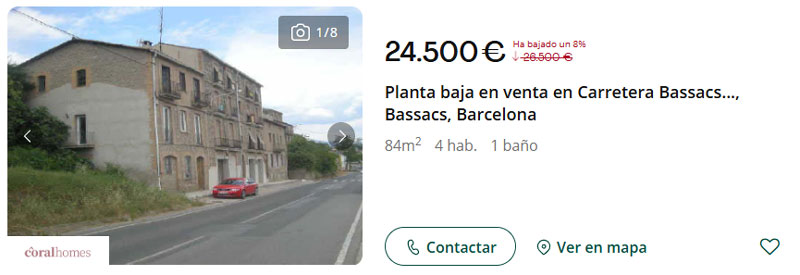 En Bassacs (Barcelona) se vende esta casa de planta baja por 24.500 euros. La vivienda consta de 84 m² superficie total construida y un patio de 40 m². La estancias de la casa se dividen en cuatro habitaciones, un baño, cocina y salón-comedor.