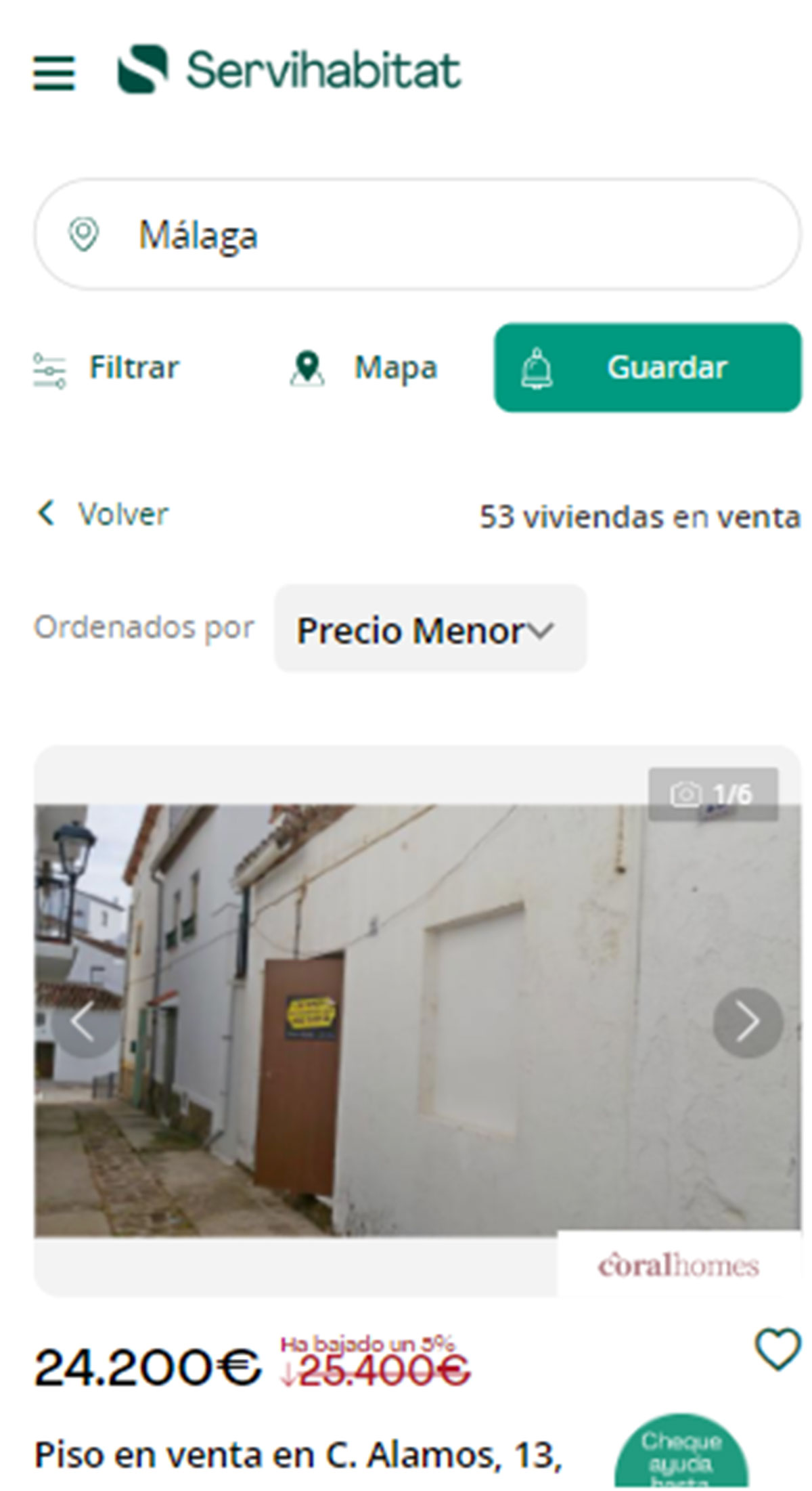 Las viviendas a la venta más baratas que pueden comprarse en Servihabitat en la provincia de Málaga tienen precios a partir de 25.000 euros. A continuación puedes consultar algunas de las ofertas más destacadas: