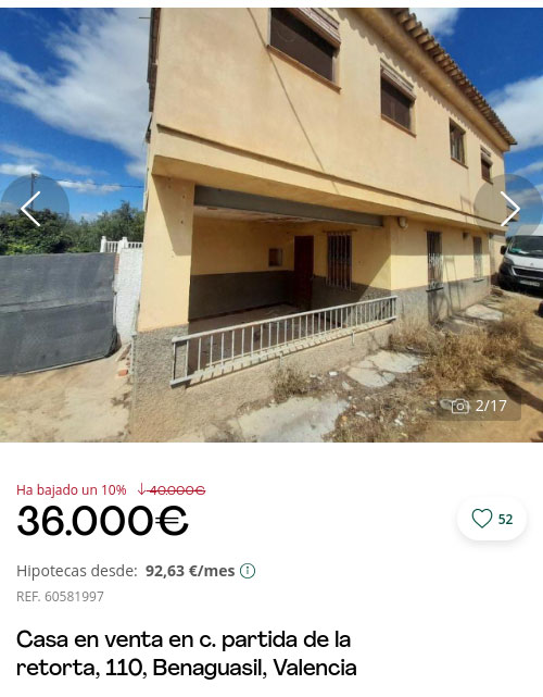 Por 36.000 euros se vende una casa en Benaguasil, Valencia. Se trata de una vivienda que tiene una rebaja aplicada en el precio del 10 %, lo que supone un ahorro de 4.000 euros respecto a su importe original. Cuenta con cuatro habitaciones y dos baños distribuidos en 98 metros cuadrados. Está construida en el año 1975 y cuenta con terraza privada. Se encuentra a una media hora del centro de Valencia y en una zona con fácil acceso a la carretera principal.