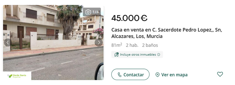 Por 45.000 euros también, se vende este chalet en Los Alcázares (Murcia). La vivienda cuenta con 81 m² de superficie construida. En total, consta de dos dormitorios, dos baños, salón-comedor, cocina, terraza, sótano, trastero de 25 m² y garaje de 22 m².