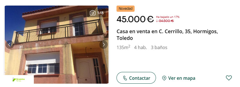 En Hormigos (Toledo) se vende esta casa por 45.000 euros. El inmueble tiene 135 m² de superficie total construida, distribuidos en cuatro dormitorios, tres baños, salón-comedor, cocina, balcón, garaje y trastero como anejos.
