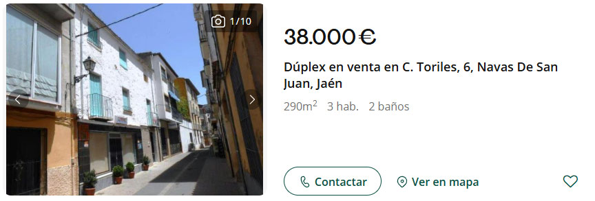 En Navas de San Juan (Jaén) se vende este dúplex por 38.000 euros. El piso cuenta con tres alturas y una superficie total construida de 290 m². Las estancias se distribuyen en sala de estar, comedor, cocina, ocho dormitorios, baño, aseo, despensa y patio.