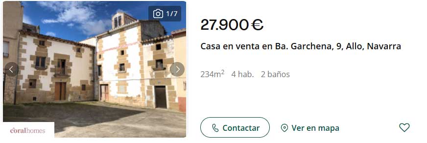 En Allo (Navarra) se vende esta casa adosada por 27.900 euros. La vivienda tiene una superficie total construida de 234 m² repartidos en tres plantas. Las estancias se distribuyen en cuatro habitaciones, dos baños, salón-comedor y cocina.