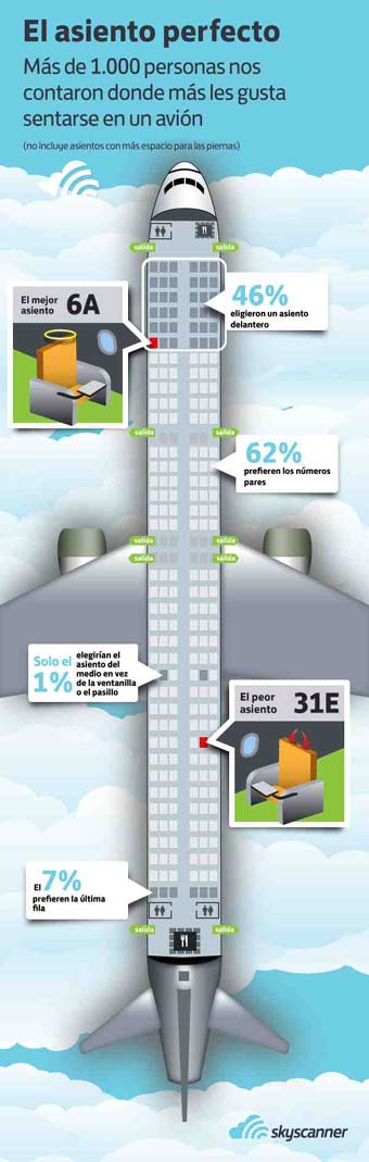 ¿Cuál es el asiento perfecto para hacer un viaje en avión? Una encuesta realizada por el portal de búsqueda de viajes Skyscanner revela qué asiento es el favorito de los pasajeros. ¿Y el más barato? La encuesta, que se ha realizado a más de 1.000 pasajeros de líneas aéreas preguntó a los encuestados sobre sus preferencias de asiento (aparte de los asientos con espacio extra en las alas) y se incluían preguntas como qué sección preferían del avión o que asiento, ventana, en el medio o pasillo. La encuesta también profundizó más para averiguar si las decisiones fueron influenciadas por los números de la suerte, así como los números de fila pares o impares. Combinando estas respuestas, el asiento más deseado en un avión estándar es el 6A.