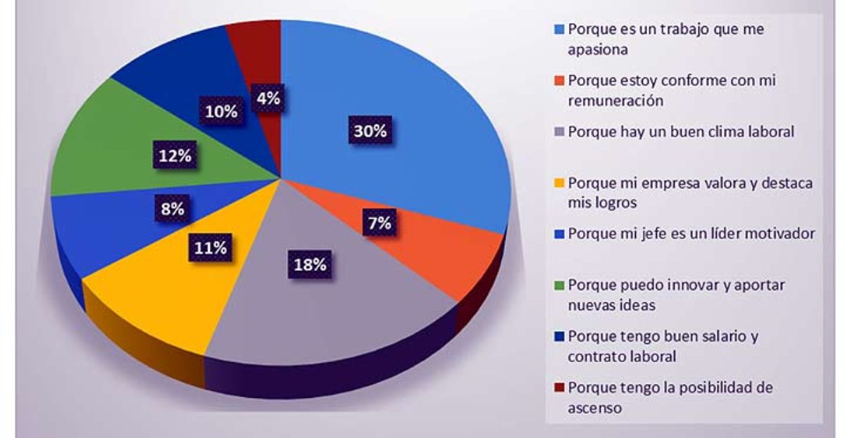 ¿Cuáles son las razones principales para que las personas se sientan a gusto con su lugar de trabajo? De las personas que indicaron en la anterior pregunta que sí estaban felices con su trabajo, un 30 % indicó que se siente bien en su puesto porque es un trabajo que le apasiona, un 18 % porque hay un buen clima laboral, un 12 % porque puede innovar y aportar nuevas ideas, un 11 % porque su empresa valora y destaca sus logros, 10 % porque tiene un buen salario y contrato laboral, un 8 % porque su jefe es un líder motivador, un 7 % porque está conforme con su remuneración y un 4 % porque tiene posibilidad de ascenso.