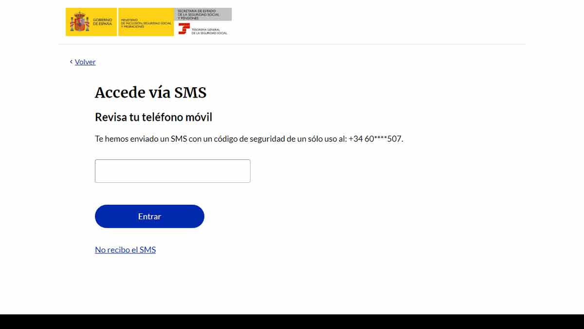 Tras introducir estos datos, la Tesorería General de la Seguridad Social va a enviarte un código por mensaje de texto a tu teléfono. Tienes que introducir esta clave en el recuadro que te aparece en pantalla y darle al botón ‘Entrar’.