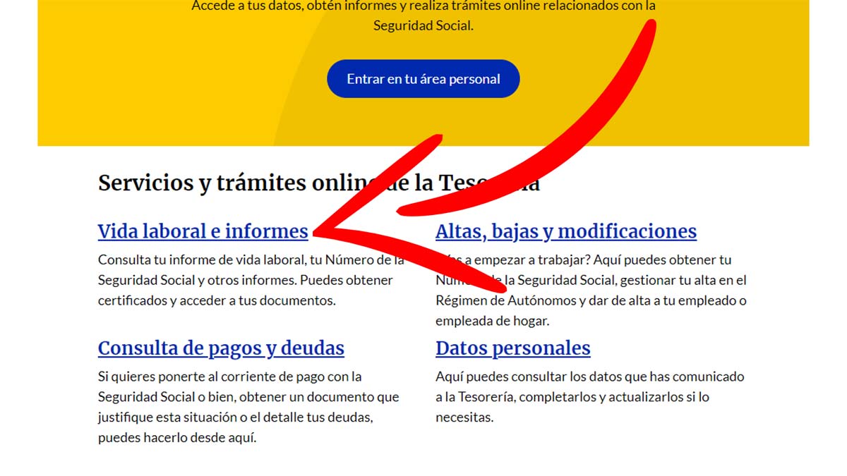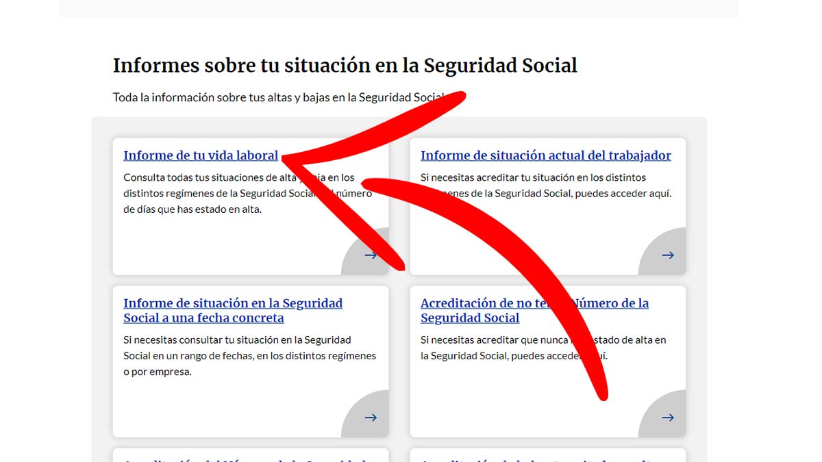 Al pulsar sobre este enlace, se abre una nueva pantalla con diferentes trámites y opciones. En este caso, tienes que seleccionar el recuadro que dice ‘informe de tu vida laboral’.