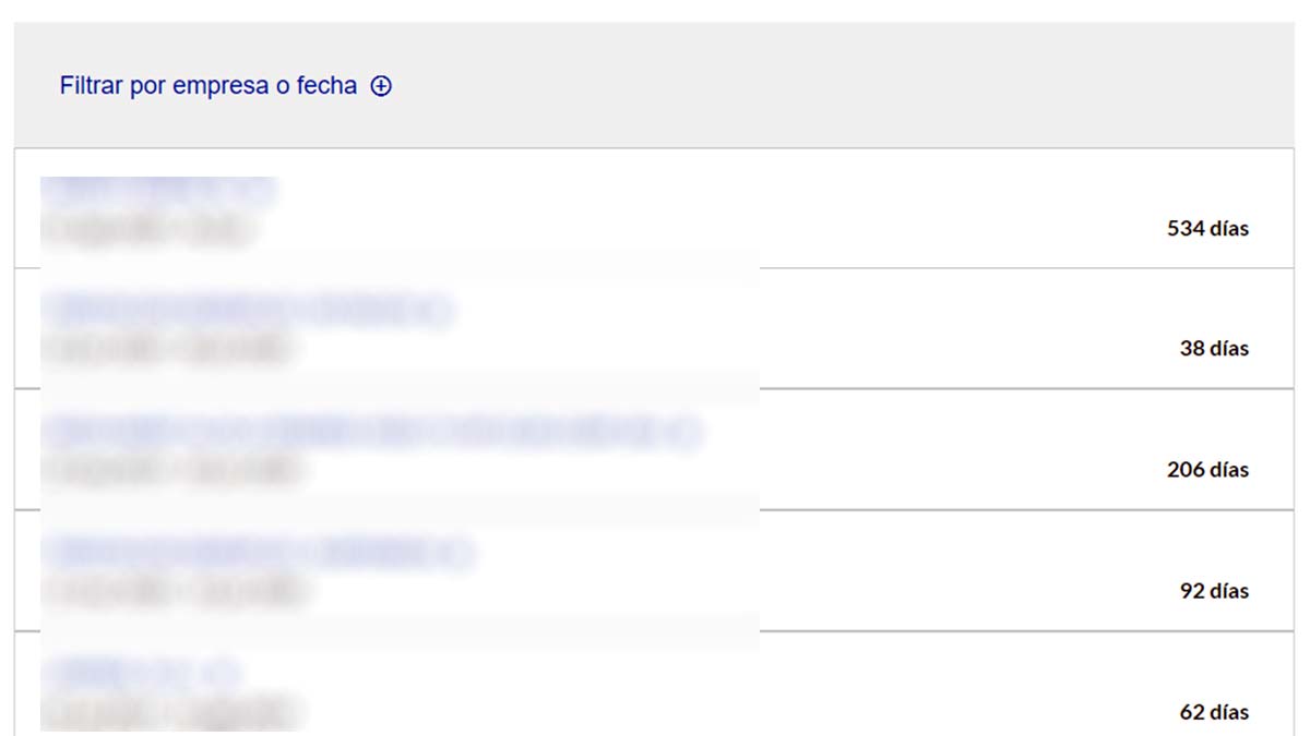 Ya puedes consultar tu informe de vida laboral en esta misma pantalla. Como puedes ver en esta imagen, al principio aparece un pequeño resumen de los días que has cotizado en total. Si te desplazas hacia abajo con el ratón, puedes ver los días que has trabajado en cada una de las empresas en las que has estado dado de alta.
