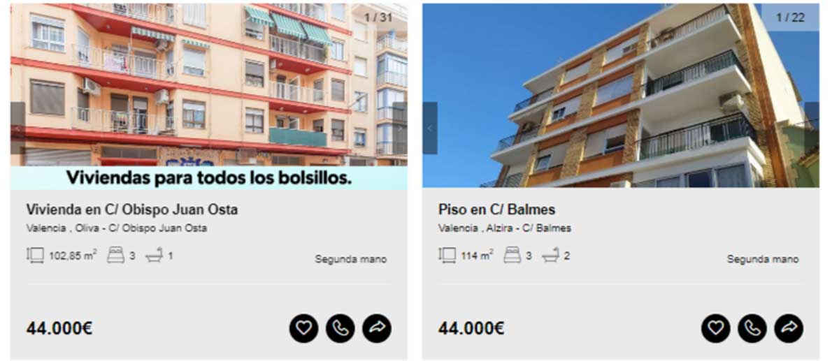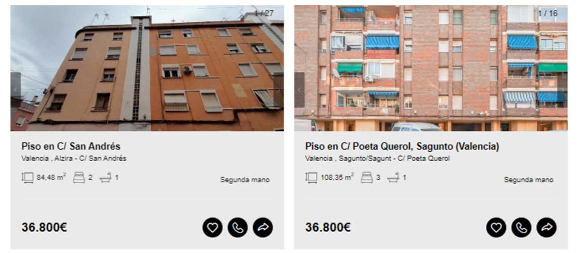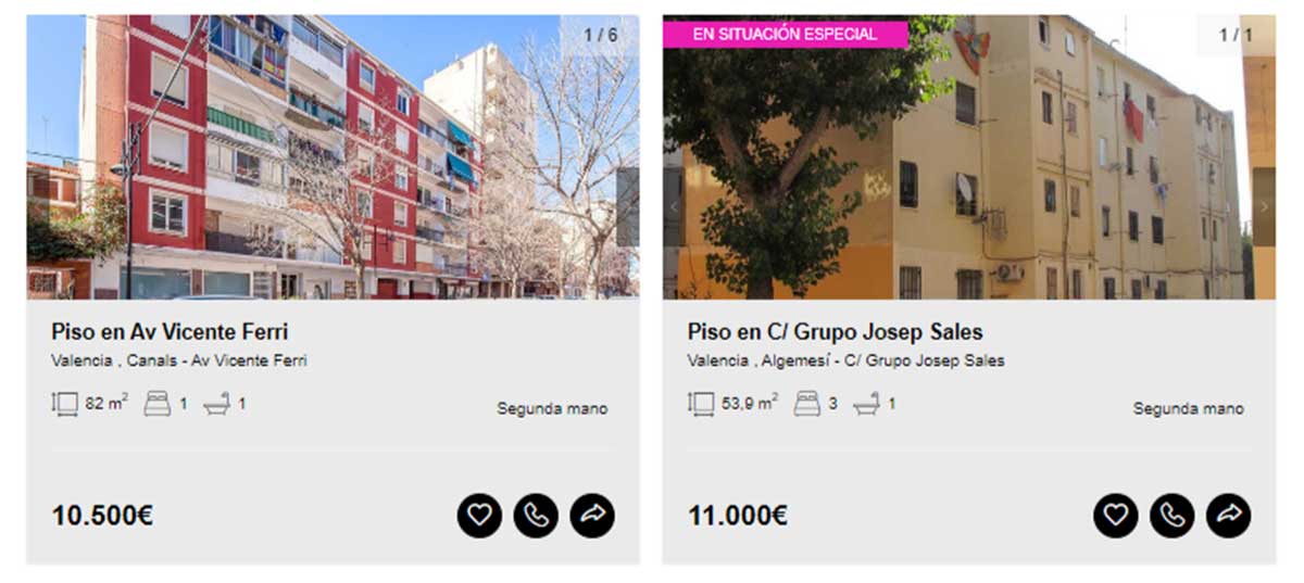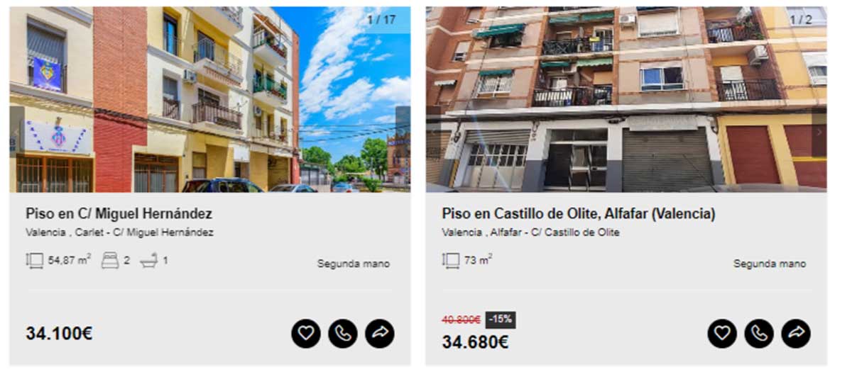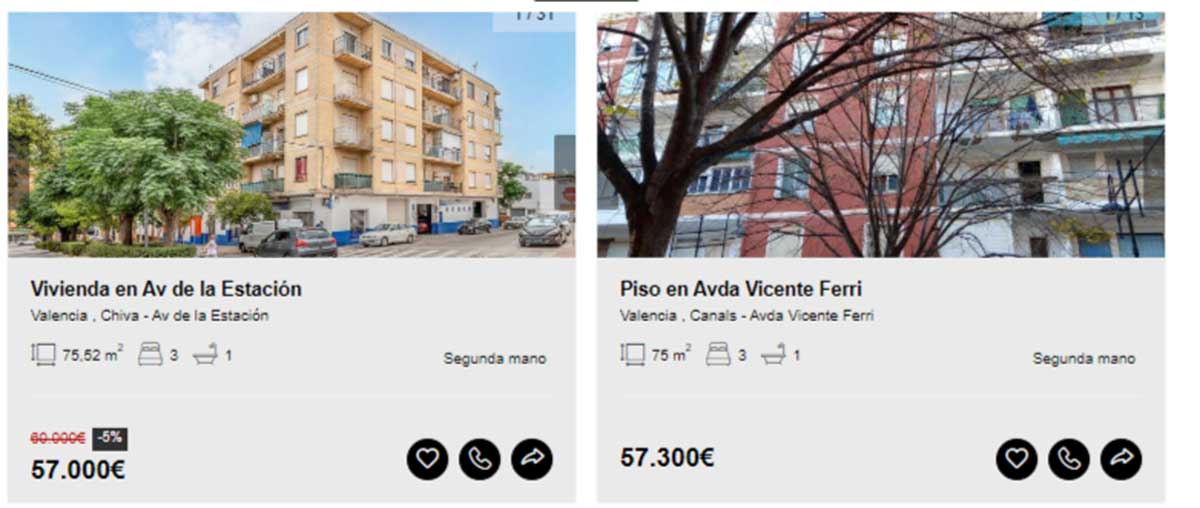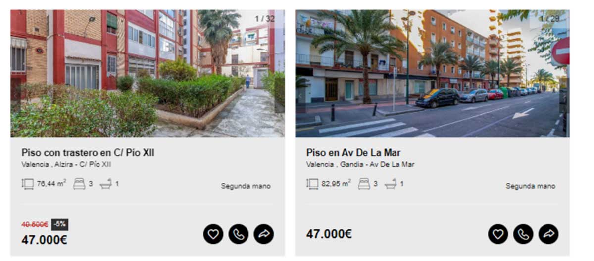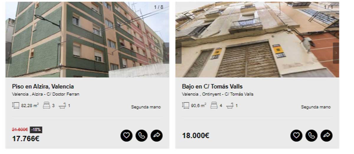 Del total del catálogo, los pisos de Solvia que pueden comprarse a un precio más bajo en la provincia valenciana parten desde los 10.000 euros. A continuación puedes ver algunos ejemplos de estos pisos baratos en Valencia: