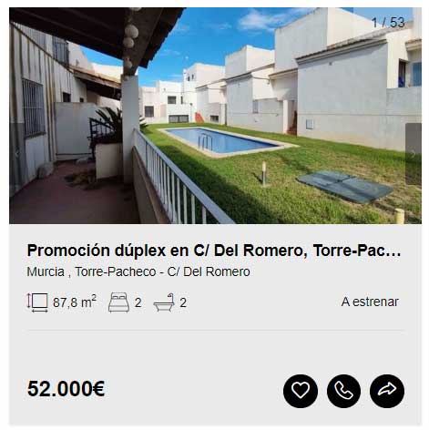 En Torre-Pacheco (Murcia) se vende este otro dúplex por 52.000 euros. Se trata de una vivienda con 87,8 m² de superficie total construida y 68.03 m² habitables. La distribución consta de dos baños, dos habitaciones, cocina y salón comedor.