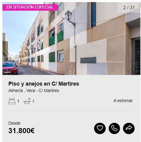 En Vera (Almería) se vende este otro piso con trastero por 31.800 euros. Se trata de un inmueble de 49 m² de superficie total construida con salón-comedor, cocina, una habitación y un baño. Incluye plaza de garaje y trastero.