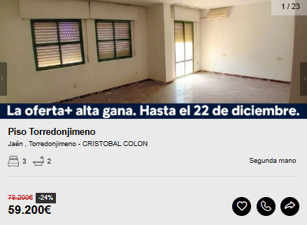 También en Torredonjimeno (Jaén) se vende este otro piso desde 59.200 euros. El inmueble tiene una superficie útil de 89,77 m², que se distribuye en un salón-comedor amplio, cocina, dos baños y tres dormitorios.