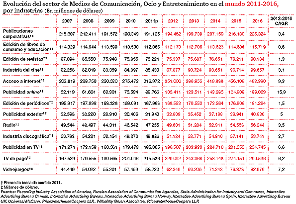 El acceso a Internet (fijo y móvil), la publicidad online, la industria del cine, la edición de periódicos, la industria discográfica, los videojuegos, entre otros, son los subsectores analizados. En España, se prevé que el mercado alcance los 33.479 millones de dólares en 2015, lo que supondrá un crecimiento del 5 % en tasa anual compuesta.