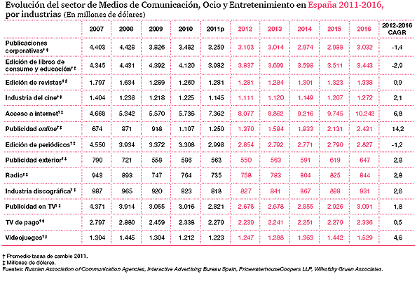 En el mercado de la prensa en España, la circulación continuará su caída, un 1,6 % en cinco años. La publicidad en papel también descenderá (-0,1 %); en cambio, la online se incrementará un 11,1 % hasta los 186 millones de dólares. Los grandes grupos ya han comenzado a interactuar con el nuevo entorno de migración a soportes digitales. Las ediciones online continuarán siendo mayoritariamente gratuitas y el gran desafío será el desarrollo de métodos de pago fiables para sus ediciones adaptadas a dispositivos como las tabletas.