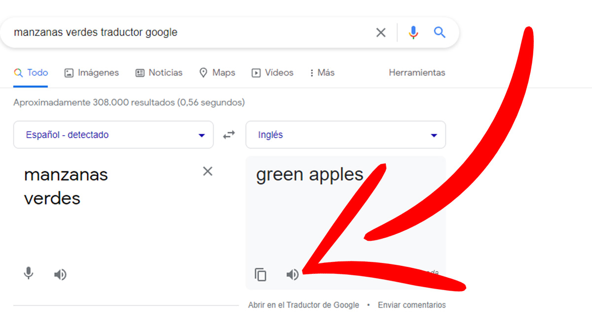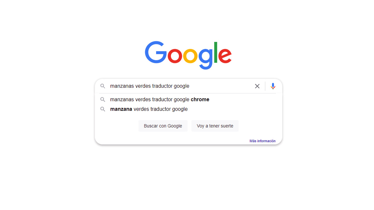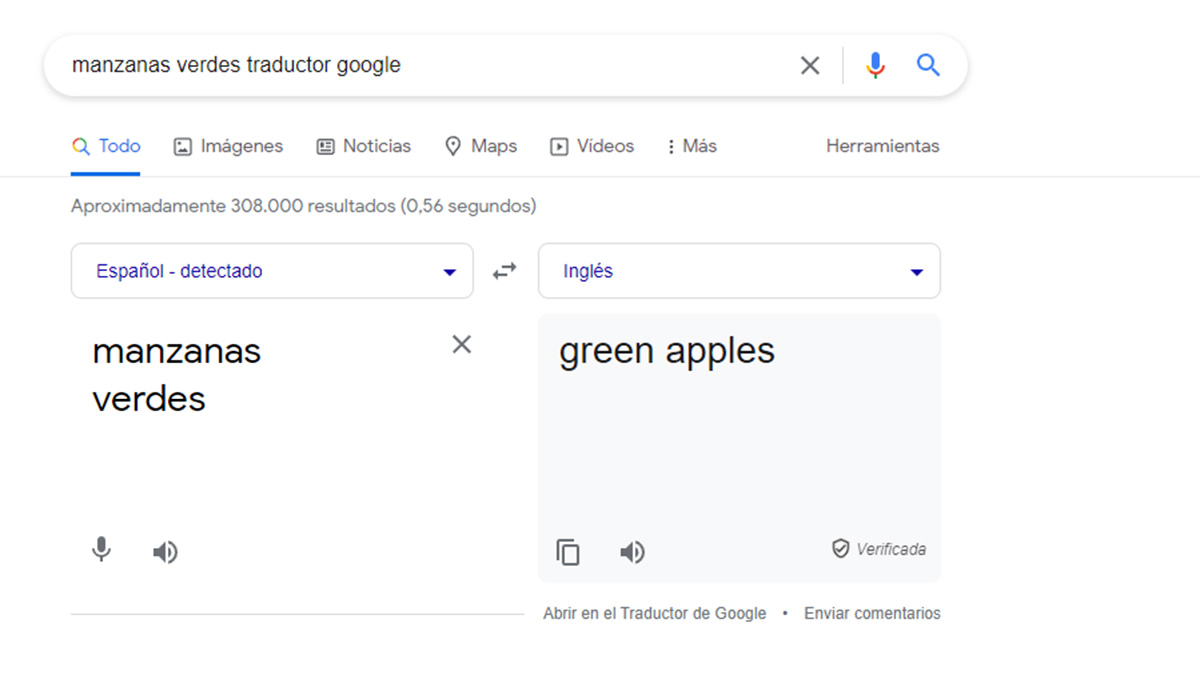 Lo vemos con un ejemplo. Escribimos ‘manzanas verdes traductor de Google‘ en la página principal del buscador.