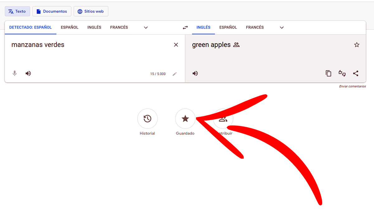 Si vas a viajar a alguna parte y quieres tener al alcance de la mano algunas frases recurrentes como ‘Hola’, ‘Adiós’, ‘Por favor’ o ‘Por dónde se va a…’, entre otros, puedes guardar estas frases en favoritos. Para guardar estas frases clave, tienes que acceder a la página oficial del traductor de Google o hacerlo desde la aplicación. En los botones que aparecen justo después del recuadro en el que puedes hacer una consulta, hay un botón en el centro que dice ‘Guardado’. En esta sección puedes guardar todas las palabras que quieras tener siempre en primer plano.
