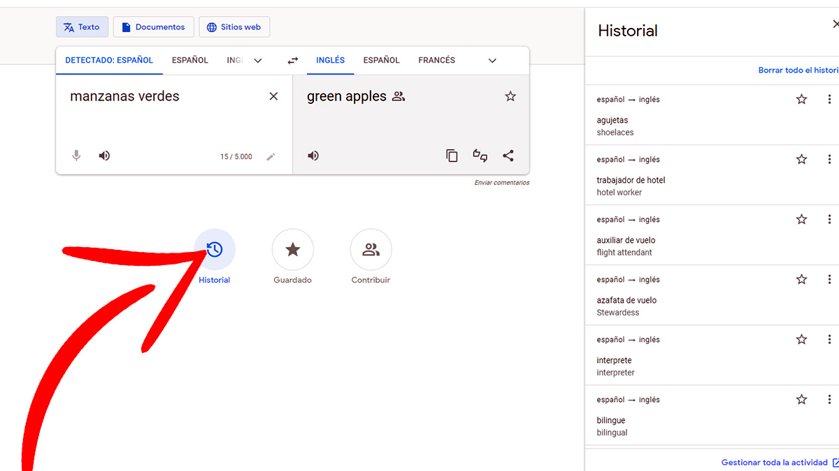 El historial de búsquedas es posible verlo desde el ordenador o el teléfono. Para ello, tienes que acceder a la página de la herramienta del traductor o abrir la aplicación. Justo debajo del recuadro donde puedes hacer las diferentes consultas, aparece un botón que dice ‘Historial’. Al pulsar sobre él, aparece un listado de todas las palabras o frases que has buscado. Es una buena forma de repasar conceptos que previamente has buscado y seguramente te suenen. Al consultar el historial te aparecen las palabras y frases tanto en el idioma en el que las buscaste como en el traducido.