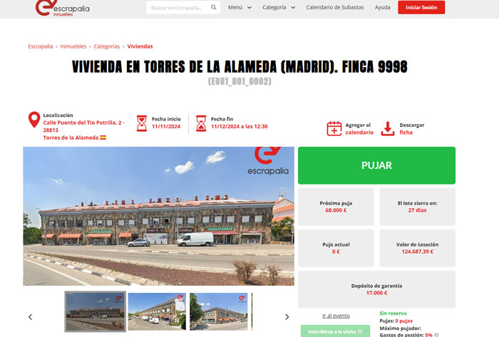 Estos inmuebles están ubicados en el municipio de Torres de la Alameda (Madrid), un zona tranquila y bien comunicada, a 40 minutos en coche del centro de Madrid. El precio de partida por la vivienda en subasta es de 68.000 euros, y el lote de las plazas de garaje y trastero de 4.600 euros.