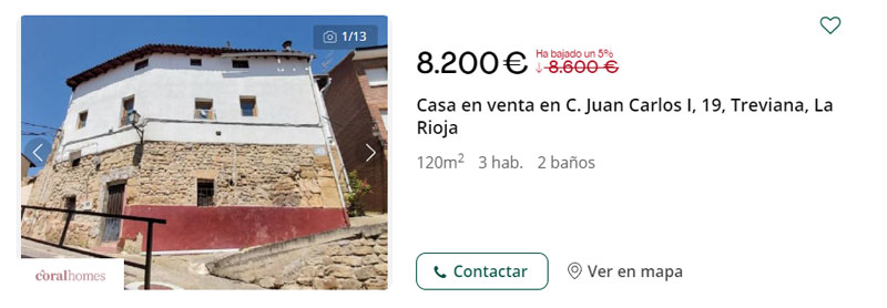En la pequeña localidad de Treviana (La Rioja), con tan solo 176 habitantes, se vende esta casa adosada por 8.200 euros. El inmueble tiene una superficie total construida de 120 metros cuadrados y distribuidos en tres plantas. Cuenta con tres habitaciones, dos cuartos de baño, cocina y salón-comedor.