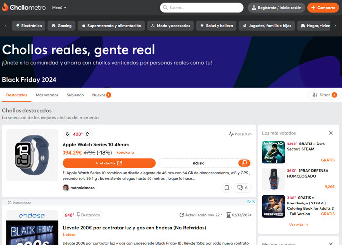 Chollometro es una de las webs más conocidas en España donde encontrar descuentos no solo en Amazon, sino en una gran variedad de tiendas online. Además, con las actuales promociones del Black Friday los usuarios postean cientos de códigos de descuentos. Una de las mayores ventajas de esta web es que los usuarios pueden calificar y puntuar las ofertas y los cupones de descuento disponibles con el objetivo de que la experiencia del resto de usuarios sea satisfactoria.