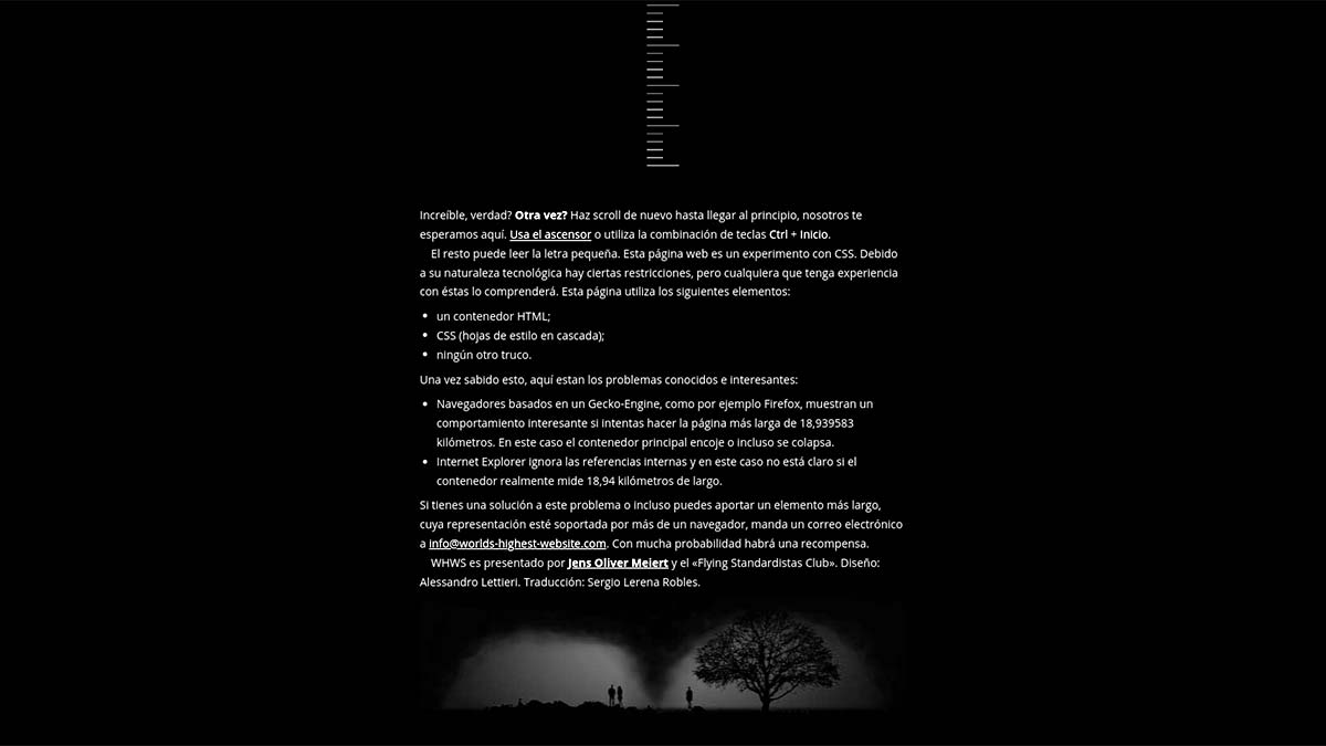 Si quieres comprobar de primera mano que la página mide los casi 19 kilómetros puedes pasarte un buen rato haciendo scroll con el ratón. Es decir, deslizándote con la rueda del ratón hasta el llegar al final de la pantalla. O, si lo prefieres, puedes utilizar el ascensor que te lleva directamente al final de manera gratuita.