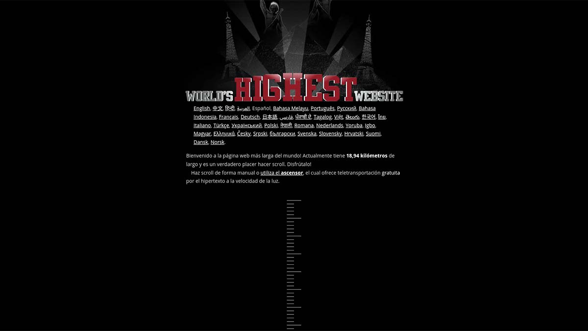 World’s Highest Website hace honor a su nombre. Esta es la página más larga del mundo, puesto que tal y como anuncian en la web tiene 18,94 kilómetros de largo.