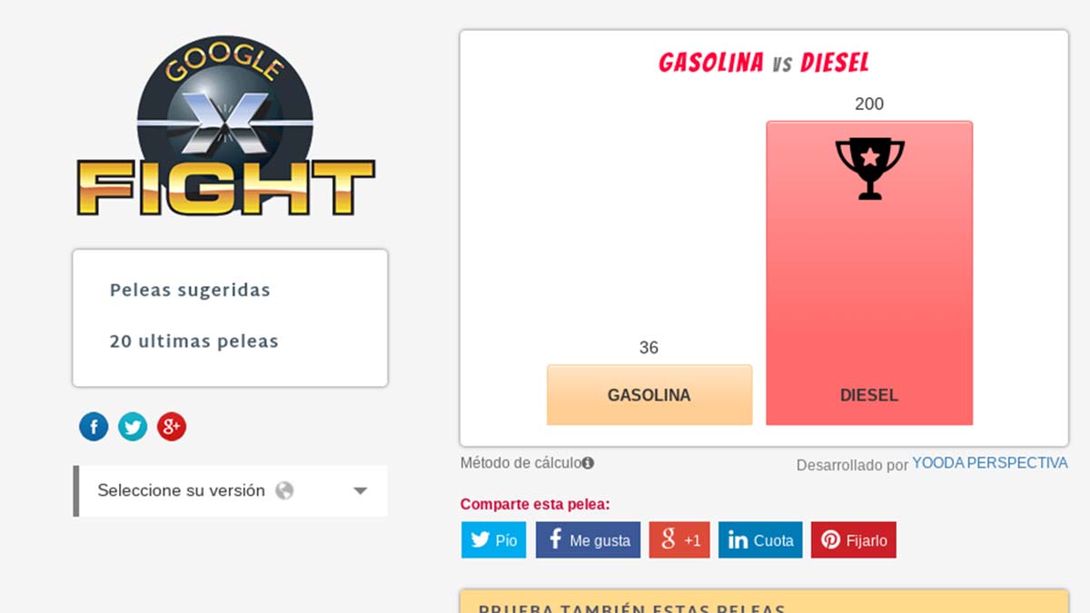 Google Fight es una página en la que puedes comprobar quién o qué es lo más buscado en este buscador en comparación con otra palabra. Solamente tienes que introducir dos palabras que estén en la actualidad y comprobar cuál tiene más búsquedas. Lo vemos con un ejemplo que compara las palabras gasolina y diesel. Como puedes ver, hay un claro ganador.