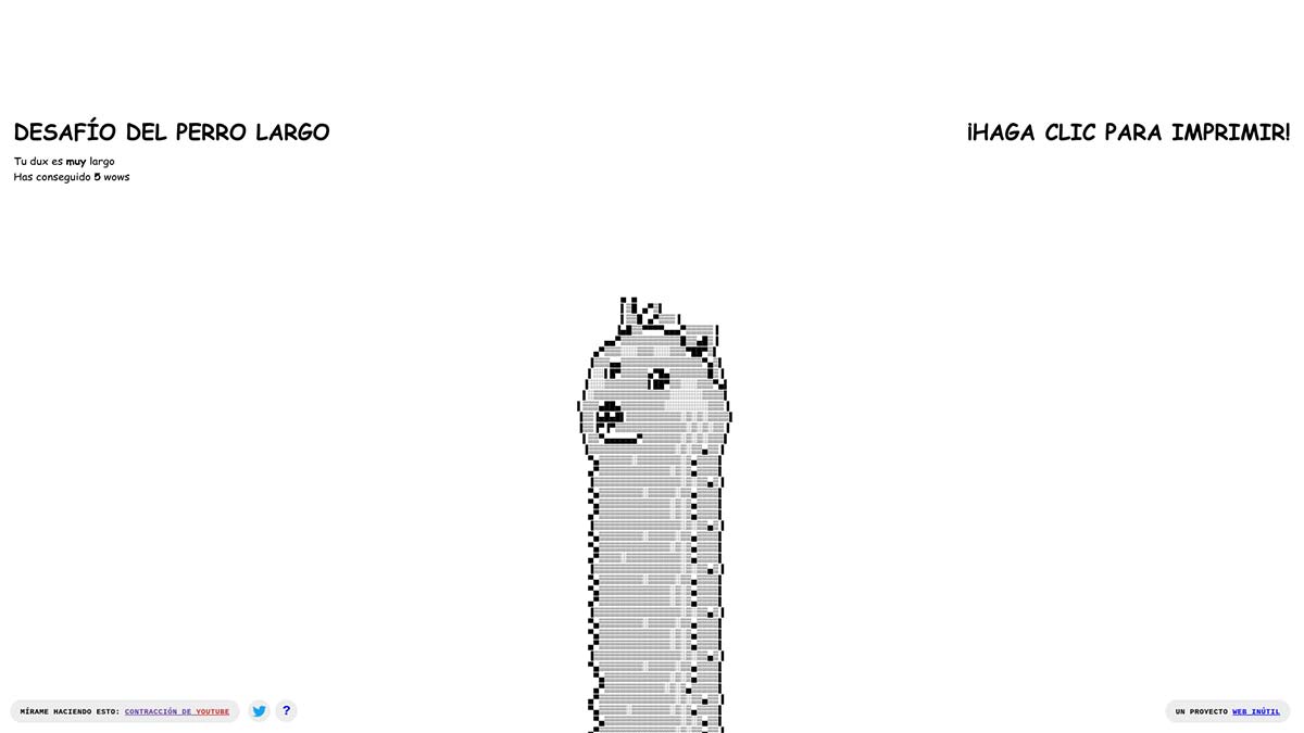 Long Doge Challenge es una página en la que tienes que conseguir crear el Doge más largo. Para ello tienes que hacer scroll con el ratón y romper tus propios récords. Es una página que te ayudará a que las horas más aburridas se pasen volando. Incluso tras batir tus propios récords puedes hacer click en la parte superior de la pantalla para imprimirlo.