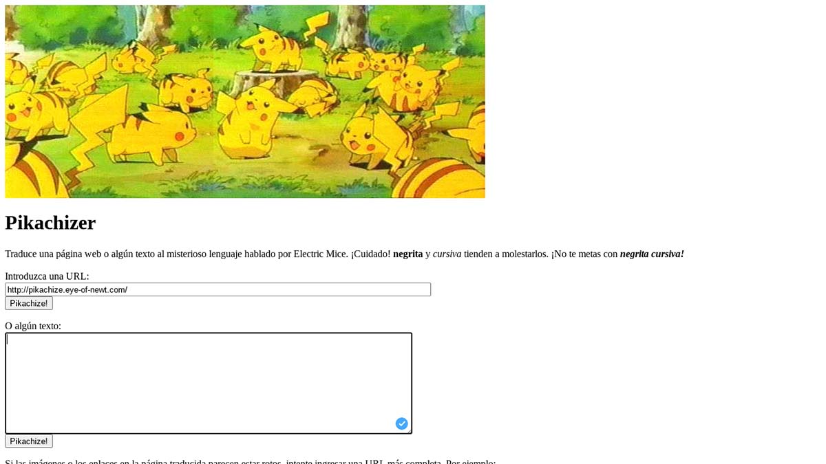 ¿Fan de Pokémon? La web Pikachizer es todo un descubrimiento para los seguidores de Pikachu. En esta página puedes escribir cualquier frase o palabra para que se traduzca al idioma de Pikachu. Sí, así de fácil. Puedes escribir todo lo que quieres y obtener la traducción en el idioma de este personaje.