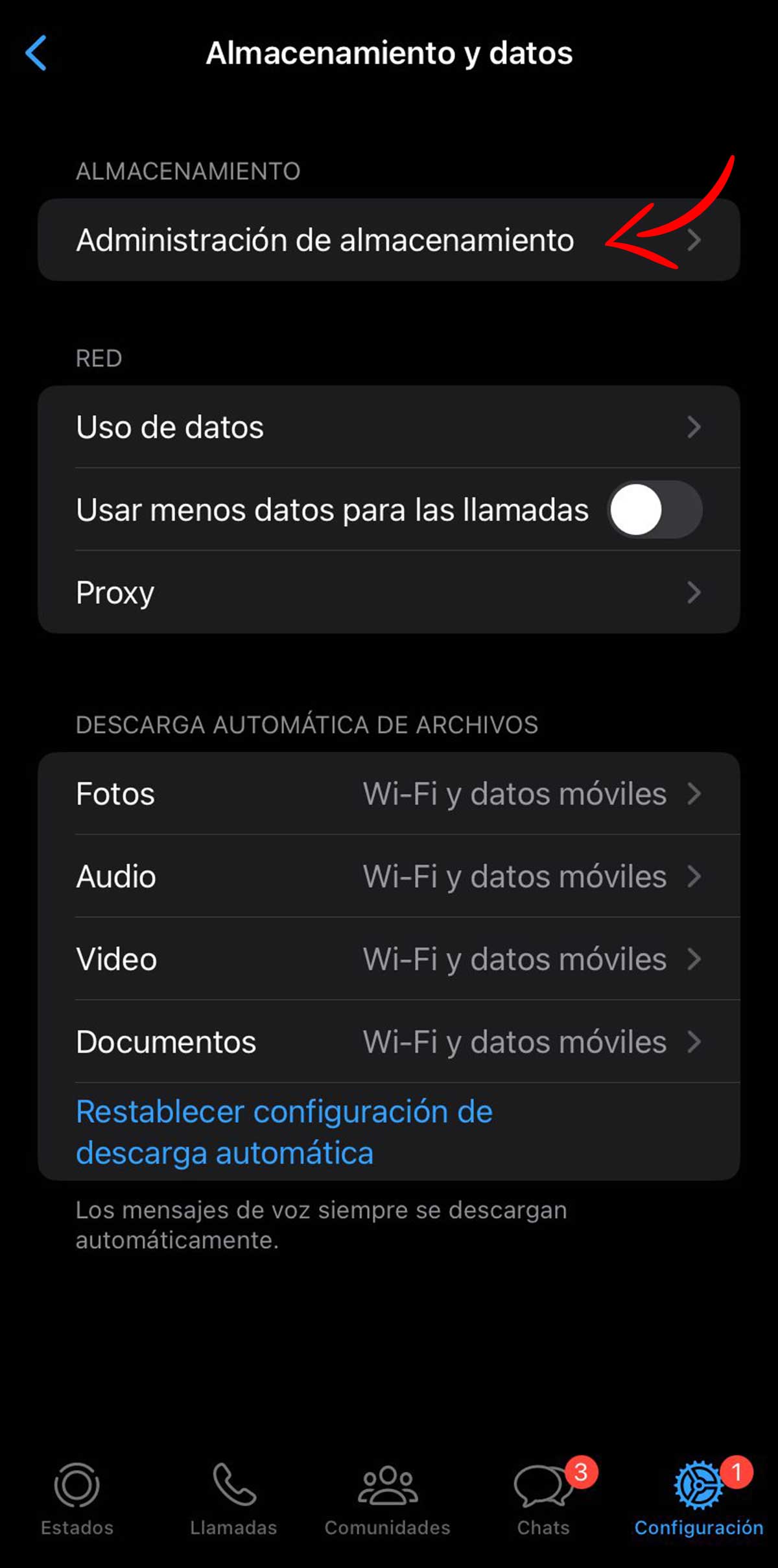 En la pantalla de la pestaña Datos y Almacenamiento, dentro de Ajustes, encontramos también la opción de descarga automática de archivos. Aparece un mensaje indicativo que nos indica que los mensajes de voz siempre se van a descargar de forma automática para dar una mejor experiencia de comunicación. Pero justo debajo de esa pestaña encontramos diferentes opciones: