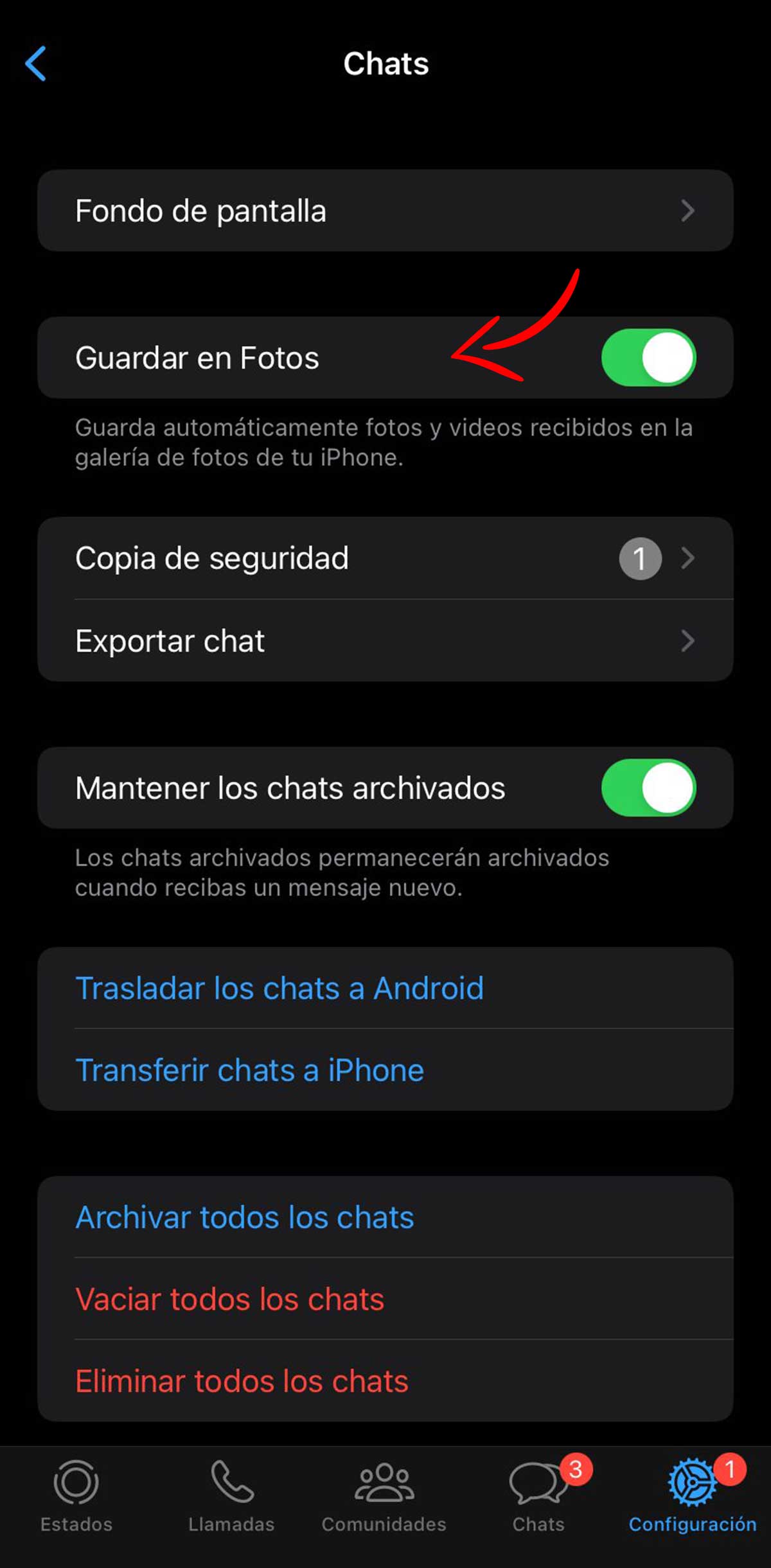 En el caso de los iPhones podemos desactivar esta opción en la zona de Configuración de WhatsApp, en la pestaña Chats, en la opción que dice Guardar en Fotos. Debajo de esta pestaña aparece una indicación que dice que si pinchamos en esta opción se guardan automáticamente las fotos y vídeos recibidos en la galería del teléfono.
